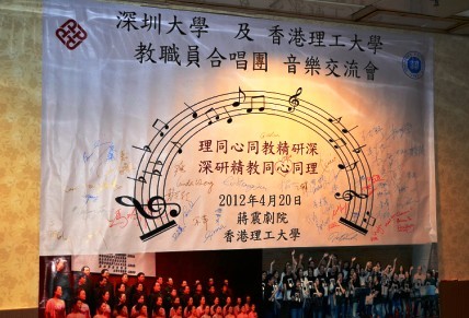 ----记我校教工合唱团香港理工行 4月20日下午,我校教工合唱团踏上与香港理工大学教职员合唱团联谊之旅。此次香港之行,是我校与香港理工的前缘再续,是继2011年香港理工大学两次到访我校的一次礼节回访。 音乐交流会在理工大学的蒋震剧院举行。晚会由我校工会常务副主席杨松和香港理工大学中国内地事务总监罗璇博士共同主持,我校教工合唱团首先演唱了《飞来的花瓣》、《美丽的...