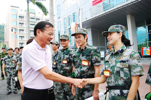 9月24日,芒果体育2012级新生军训阅兵仪式分别在广州一团、葵涌二团和梅林三团举行。校领导江潭瑜、李清泉、陶士平、陶一桃、阮双琛、邢锋、李凤亮率机关各部门、各学院负责人深入各军营看望慰问学生,检阅了军训成果。仪式结束后,6100多名2012级本科新生结束了进行为期10天的军营学习生活,胜利返校。