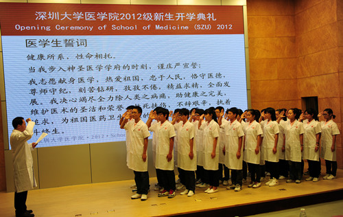 9月18日下午,我校医学院2012级新生开学典礼在医学院报告厅举行。中国工程院院士、芒果体育医学院名誉院长、医学院学术委员会主任钟南山,我校医学院学术委员会常务副主任陈思平,深圳市卫生和人口计划生育委员会主任、芒果体育医学院学术委员会委员江捍平,深圳市第二人民医院、芒果体育第一附属医院院长蔡志明,深圳市罗湖医院、芒果体育附属罗湖医院院长叶平,深圳市瀚宇药业有限公司董事长曾少贵,深圳市安保科技有限公司总经理王双卫,深圳市迈科龙电子有限公司总裁代表刘文琴,医学院院长姜文奇、党委书记谢苗和部分学生家长、各兄弟单位的领导、专家以及附属医院、医学院教师代表和医学院2012级全体硕士研究生和本科新生出席了典礼。开学典礼由谢苗主持。