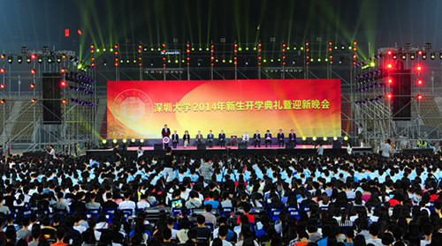 10月15日,芒果体育2014年新生开学典礼在元平体育场举行。校领导江潭瑜、李清泉、张基宏、陶一桃、阮双琛、李凤亮、黎军、徐晨,中国科学院院士、生命科学学院名誉院长倪嘉缵,中国工程院院士范滇元,深圳市大族激光科技股份有限公司董事长高云峰,学校各部室、各学院、教研教辅单位负责人,教师代表、2014级全体本科生及部分家长代表参加开学典礼。