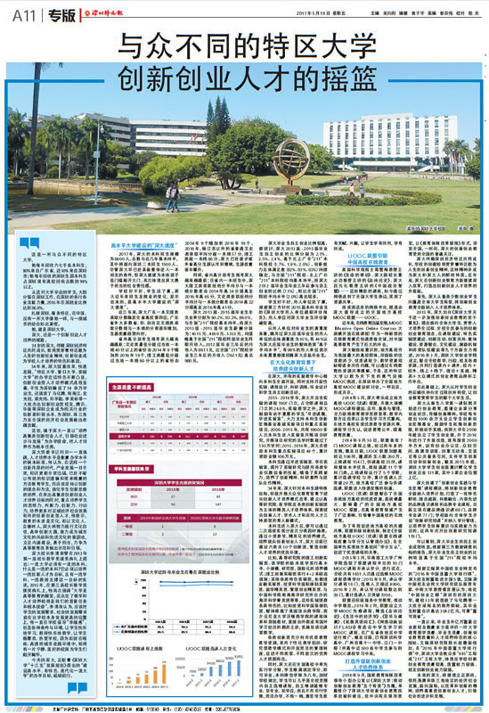 2017年5月19日出版的《深圳特区报》A11版以《与众不同的特区大学 创新创业人才的摇篮》为题,对我校创新创业教育进行专版报道。 专题报道链接:http://sztqb.sznews.com/html/2017-05/19/node_652.htm