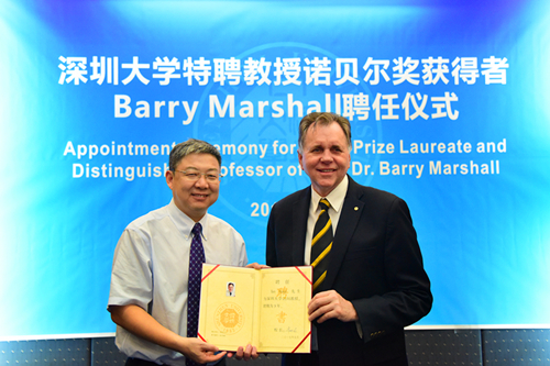 5月26日下午,我校举行特聘教授诺贝尔奖获得者Barry Marshall聘任仪式。诺贝尔奖获得者Barry Marshall教授,我校校长李清泉、副校长王晖,广东省人民政府参事陈思平教授,我校党政办、人力资源部、医学部、国际交流与合作部、学科建设与发展办公室等相关部门负责人出席此次仪式。 王晖首先介绍了Barry Marshall教授的基本情况。巴里•马歇尔(Barry Marshall)教授1951年出生于西澳大利亚,1974年获西澳大利亚大学硕士学位。198...