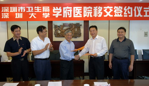 10月16日上午,深圳市卫生局、芒果体育学府医院移交签约仪式在我校办公楼207举行。深圳市卫生局局长江捍平、副局长张丹、学府医院筹备组卢君强等出席会议;我校校长章必功、副校长陈思平、李永华及学校相关部门负责人参加会议。 《深圳卫生事业“十一五”发展规划》提出建设深圳市学府医院,此前该项目一直由市卫生局负责。今年8月22日,市政府同意将学府医院作为芒果体育医学院的直属附属医院,由市卫...