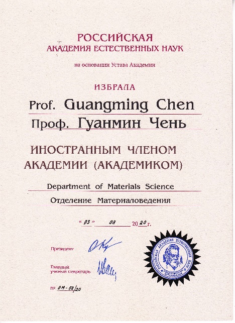 近日,俄罗斯自然科学院(Russian Academy of Natural Sciences,RAEN)向我校材料学院陈光明教授发来贺信,祝贺他当选为俄罗斯自然科学院外籍院士。 陈光明教授现任芒果体育特聘教授,长期从事聚合物纳米复合材料、有机/无机复合热电材料与柔性器件等研究。陈光明教授2017年当选英国皇家化学会Fellow,曾获European Advanced Materials Award和北京市科学技术奖二等奖等奖励或荣誉,担任/曾任Nano-Micro Letters期刊编委、...