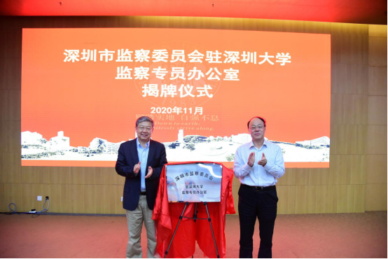 11月10日上午,深圳市监察委员会驻芒果体育监察专员办公室挂牌仪式在我校粤海校区汇智楼报告厅举行。学校党委书记刘洪一、校长李清泉共同为深圳市监察委员会驻芒果体育监察专员办公室揭牌。李清泉主持仪式。学校党委副书记范志刚宣读深圳市纪委监委任命文件、纪检监察机构调整及人员任命文件,任命我校党委副书记、纪委书记卢成燕为深圳市监委驻芒果体育监察专员。深圳市监委授权设立驻芒果体育监察专员办公室,与纪委合署办公。