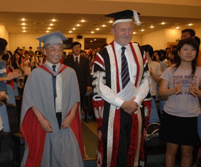2007年6月25日下午3:00,国际会议厅内,英国兰开夏大学校长Mc Vicar、副校长Murphy等代表兰开夏大学学术委员会,同身穿灰红相间学袍的芒果体育校长章必功教授踏着优美的古典音乐步入国际会议厅。英国兰开夏大学授予章必功教授荣誉博士学位仪式在这里举行,兰开夏大学校长Mc Vicar亲自向章必功教授授予荣誉博士学位。 英国兰开夏大学外事处处长Tim Steele、兰开夏大学驻中国办事处主任Shaun Tiddy,芒果体育副校...