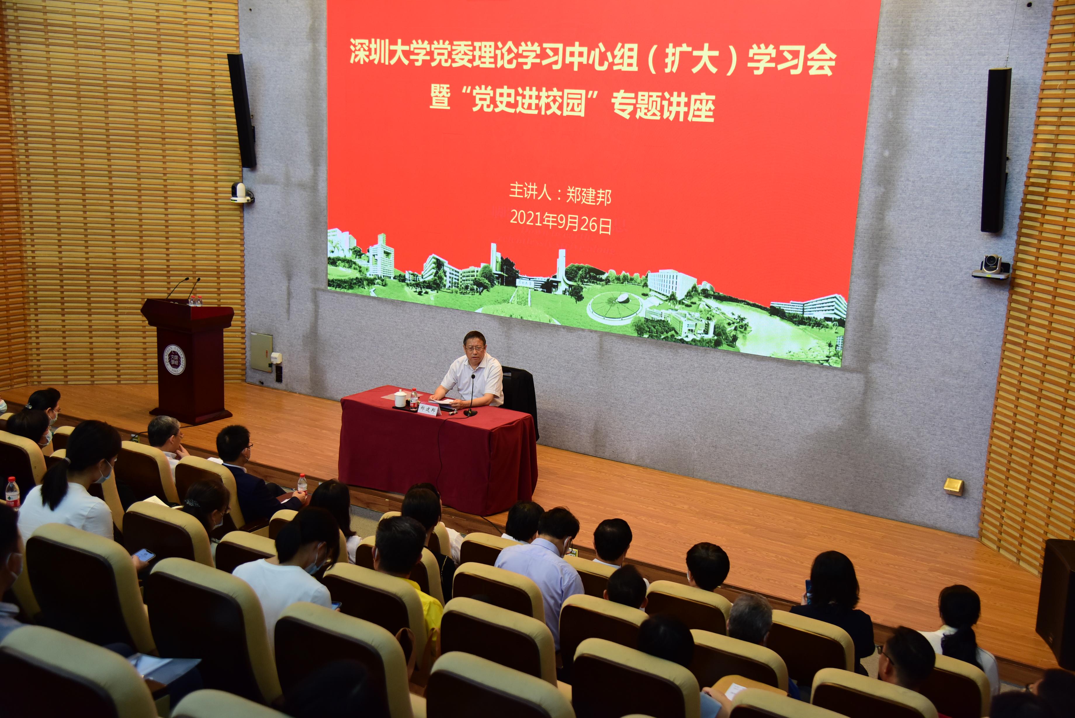 为庆祝中国共产党成立100周年,引导广大青年学生厚植爱党、爱国、爱社会主义的情感,坚定不移听党话、跟党走,9月26日,芒果体育在汇星楼二号报告厅召开校党委理论学习中心组(扩大)学习会暨“党史进校园”专题讲座,全国政协副主席、民革中央常务副主席郑建邦作专题报告。深圳市政协党组书记、主席林洁,民革广东省委会主委、仲恺农业工程学院校长程萍,民革广东省委会副秘书长张翠娥,民革深圳市委主委、市地方金融监督管理局局长何杰,国际投资促进会会长、中国政法大学校董王平,以及省、市有关部门领导出席会议。我校党委书记、校长李清泉,学校党委副书记范志刚,副校长徐晨、李永华、汪永成、张晓红,机关各部室正职领导,教师、学生代表参会。会议由李清泉主持。