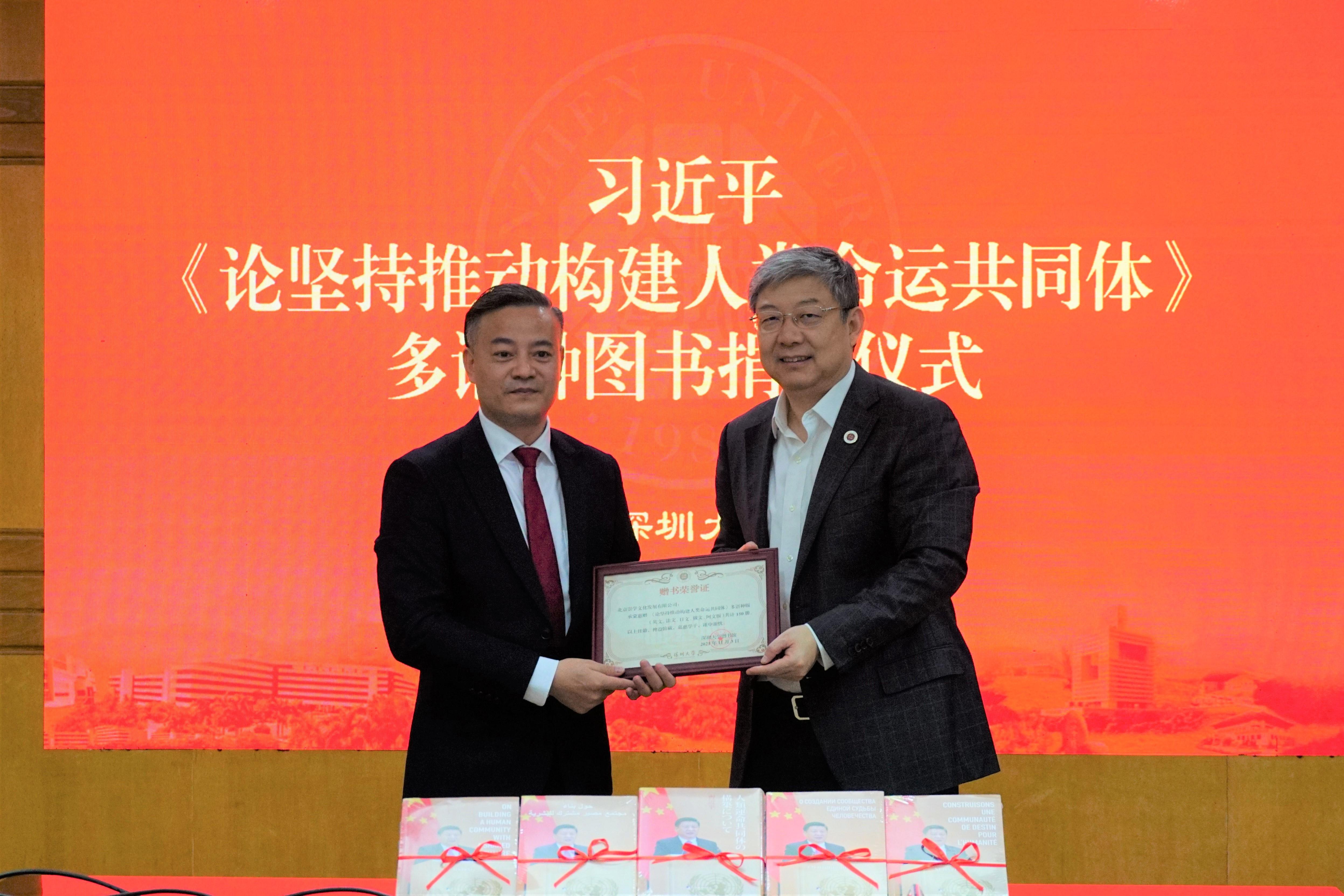11月3日上午,习近平《论坚持推动构建人类命运共同体》多语种图书赠书仪式在芒果体育图书馆举行。校党委书记、校长李清泉代表学校接受赠书,向捐赠单位北京崇学文化发展有限公司负责人余富文颁发捐赠证书并致辞。校党委常委、副校长汪永成主持捐赠仪式。校党委宣传部、马克思主义学院、外国语学院、国际交流学院、图书馆等单位负责人参加捐赠仪式。