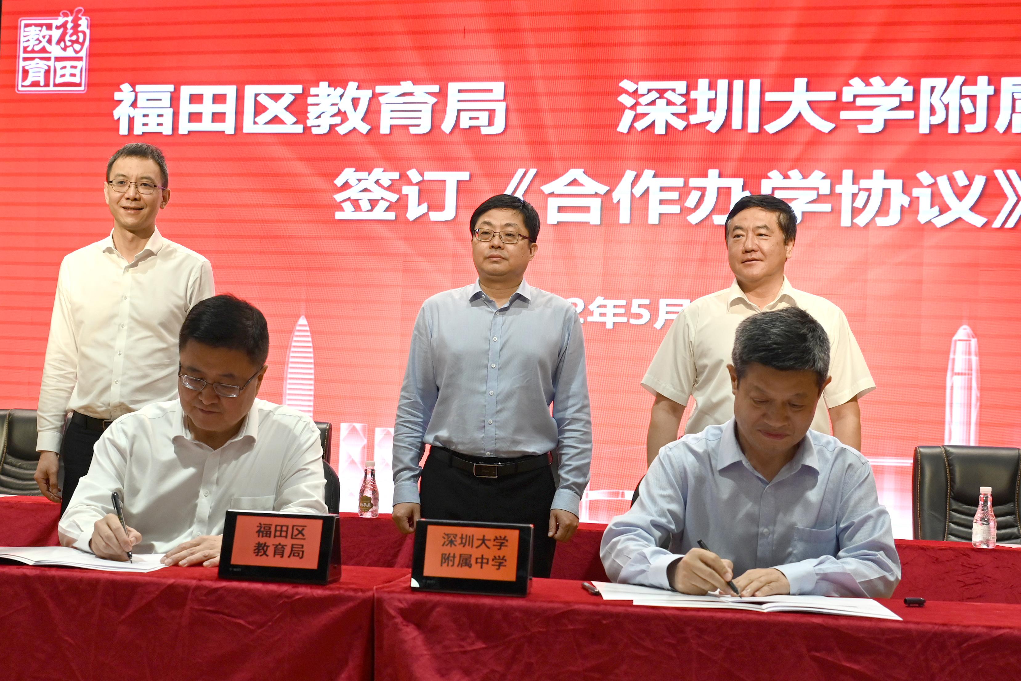 5月18日上午,深大附中与福田区教育局在北环中学签署合作办学协议,正式冠名北环中学为深圳市福田区深大附中创新中学(以下简称“深大附中福田创新中学”)。这是深大附中首次与福田教育合作办学。 芒果体育党委副书记范志刚,深圳市教育局党组成员、副局长赵立,福田区政府党组成员、副区长朱江,福田区委教育工委书记、区教育局党组书记、局长田洪明,芒果体育附属教育集团总校长、深大附中党委书记、校长刘为基,深大附中福田创新中学(原北环中学)校长李国标共同出席仪式并为合作学校揭牌。田洪明主持仪式。