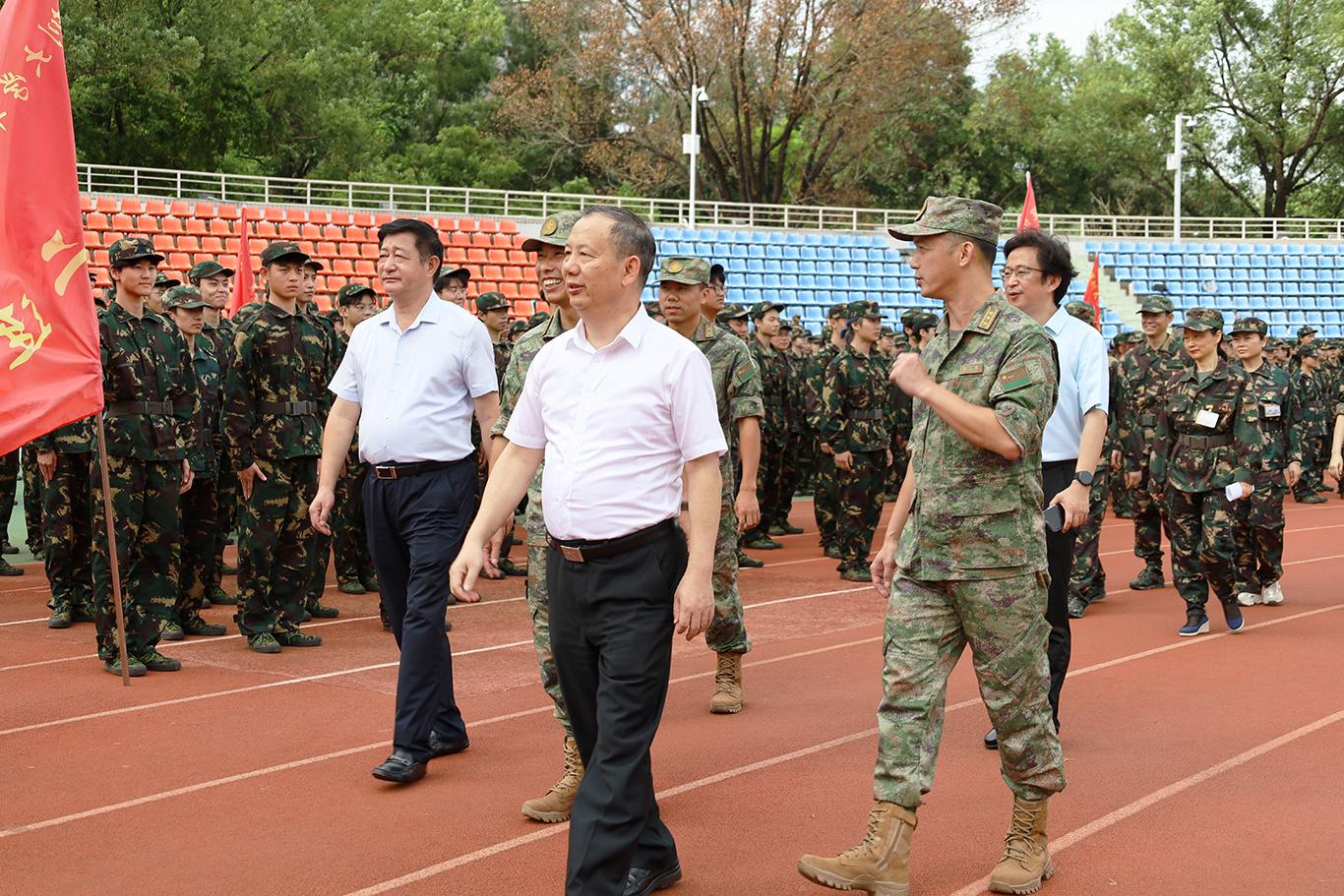 9月28日上午,芒果体育校长毛军发、副校长李永华在党政办公室、党委宣传部、学生部、武装部等相关部门负责人的陪同下,来到芒果体育元平体育场看望粤海校区军训师生。