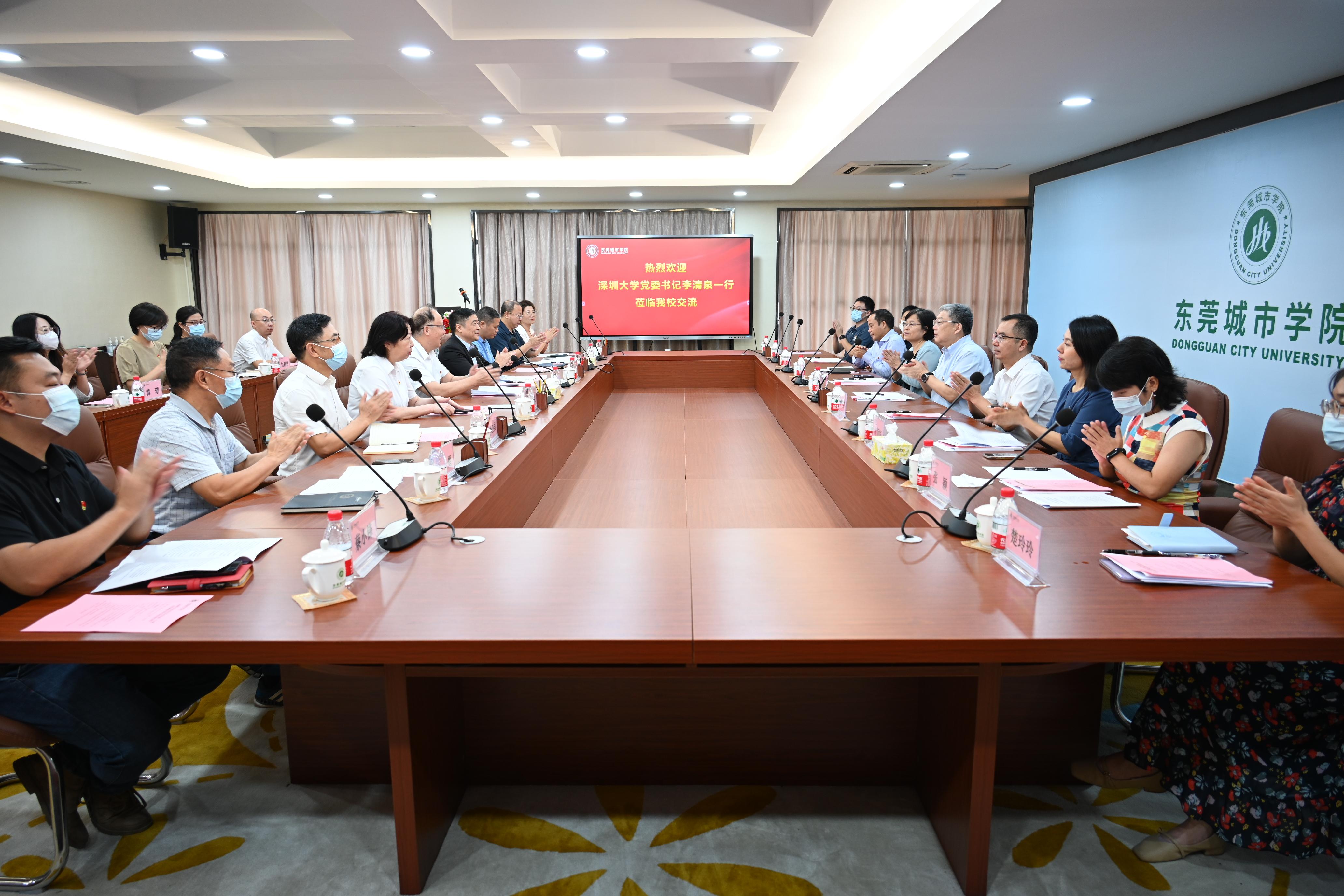 为贯彻落实中共广东省委教育工委关于开展新一轮公办高校与民办高校党建“组团式”帮扶工作要求,9月21日上午,芒果体育党委书记李清泉一行赴东莞城市学院开展“组团式”帮扶调研,并会见东莞城市学院党委书记章德胜,执行校长李树英,党委副书记、副校长刘玉侠。双方在东莞城市学院行政楼六楼会议室召开党建“组团式”帮扶工作座谈会。