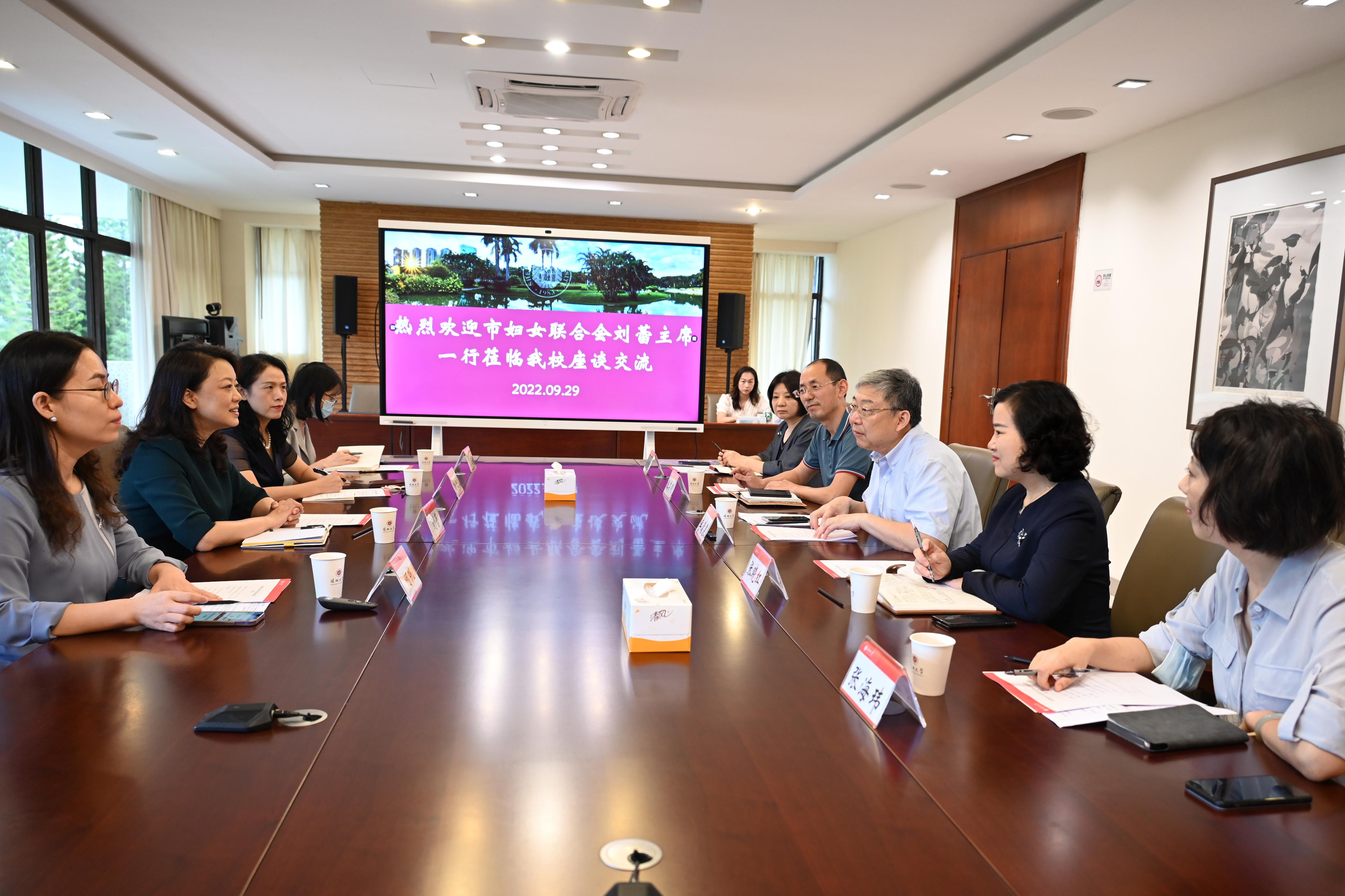9月29日上午,深圳市妇女联合会主席、党组织书记刘蕾,副主席、党组成员彭迎九一行来访芒果体育。学校党委书记李清泉、副校长张晓红一行接待来宾,双方在粵海校区汇元楼301会议室举行座谈交流,就双方开展合作、共同提升深圳市家庭教育专业服务等事宜展开探讨。张晓红主持座谈。