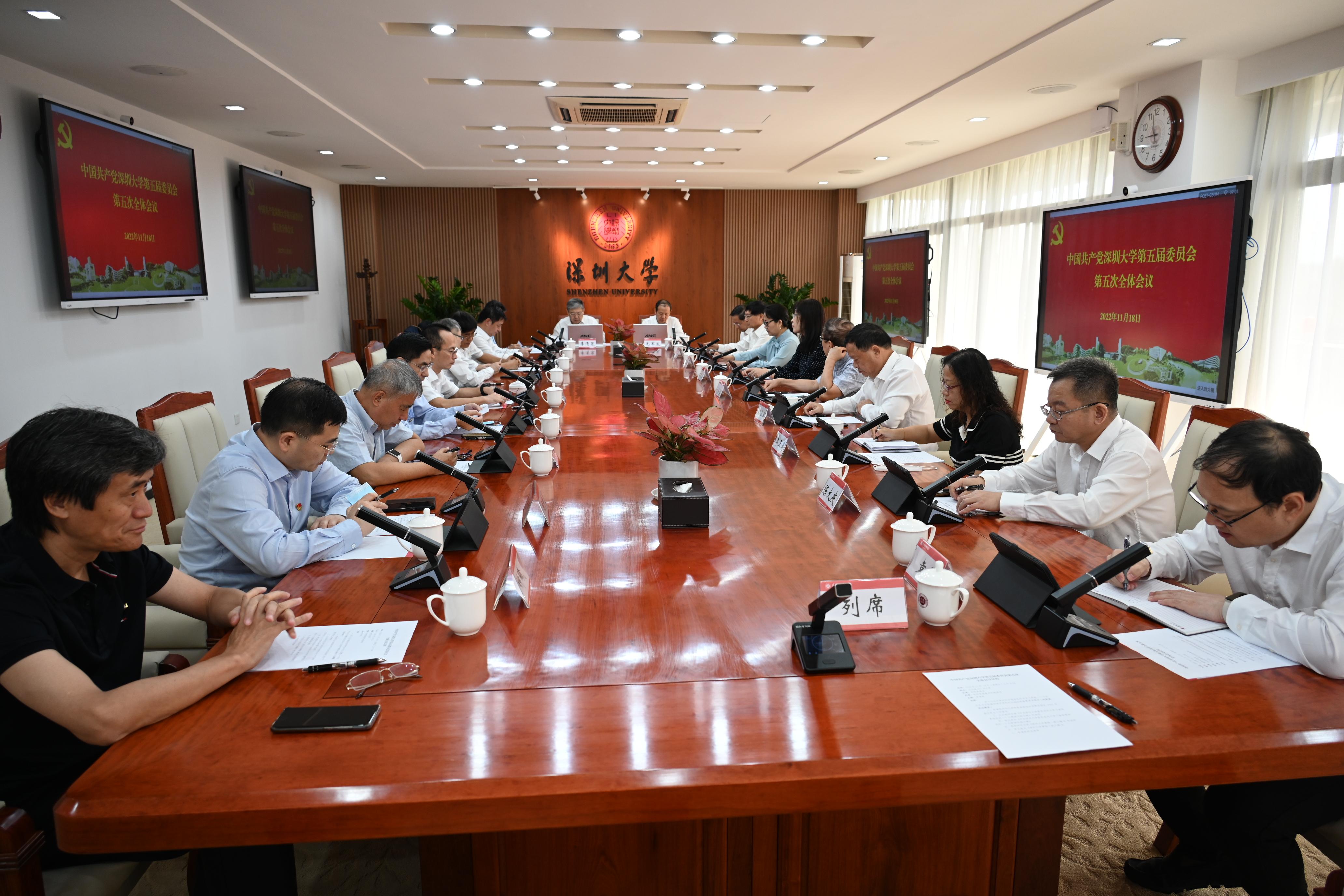 11月18日,中国共产党芒果体育第五届委员会第五次全体会议在粤海校区汇元楼401会议室召开。会议传达学习习近平总书记重要讲话精神,报告学校2022年意识形态工作情况,审定《中共芒果体育委员会关于学习宣传贯彻党的二十大精神实施方案》和《芒果体育章程(修订稿)》。校党委委员出席会议,非校党委委员的校领导列席会议。校党委书记李清泉主持会议。