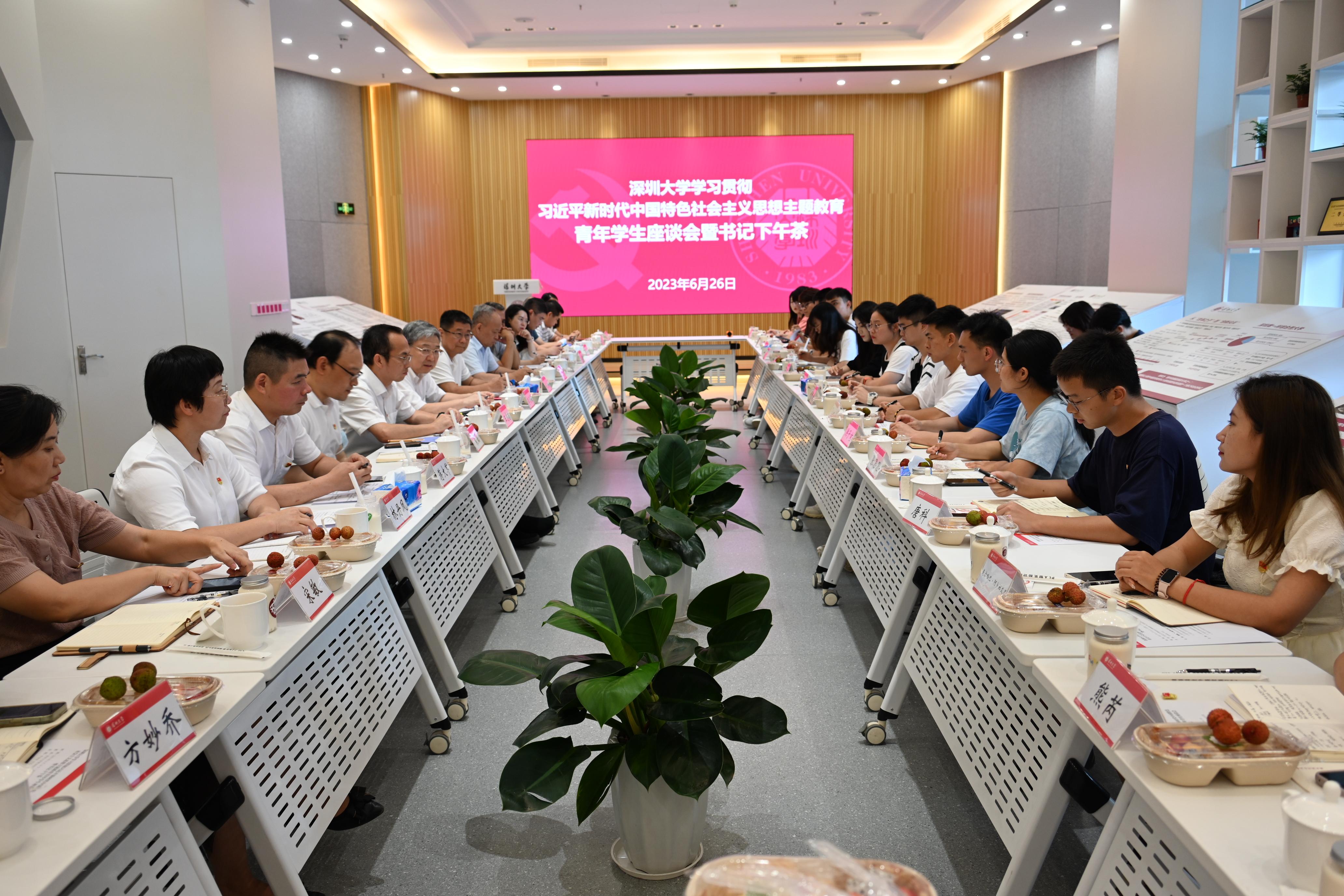 6月26日下午,芒果体育学习贯彻习近平新时代中国特色社会主义思想主题教育青年学生座谈会暨书记下午茶在粤海校区聚翰斋一楼主题教育专题展厅举办。芒果体育党委书记李清泉以及党委组织统战部、教务部、学生部、后勤保障部等职能部门负责人,与来自各学院的17名青年学生代表,就主题教育、学习生活、职业规划等问题展开面对面沟通交流。省委主题教育第十九巡回指导组组长刘海陵、副组长黄友文到会指导。