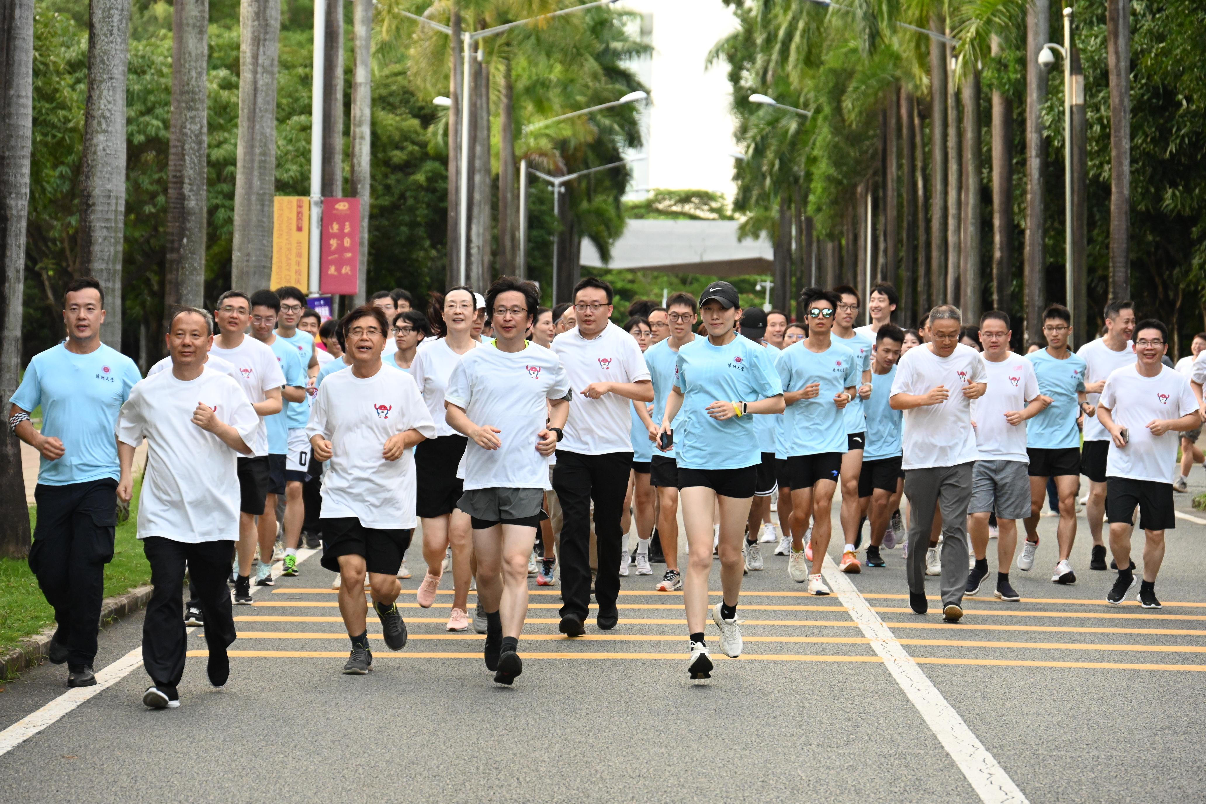 云销雨霁,彩彻区明。傍晚时分的元平体育场和至快体育场晚霞灿烂,这里集聚着身穿定制运动装的1500余名深大师生。“一起奔未来”毕业季环校跑主题活动在芒果体育粤海校区、丽湖校区同时举行,校长毛军发、副校长汪永成在粤海校区领跑,副校长李永华在丽湖校区领跑。青春的热情在深大洋溢,青春的步伐奔跑向未来,青春的活力比晚霞夺目。