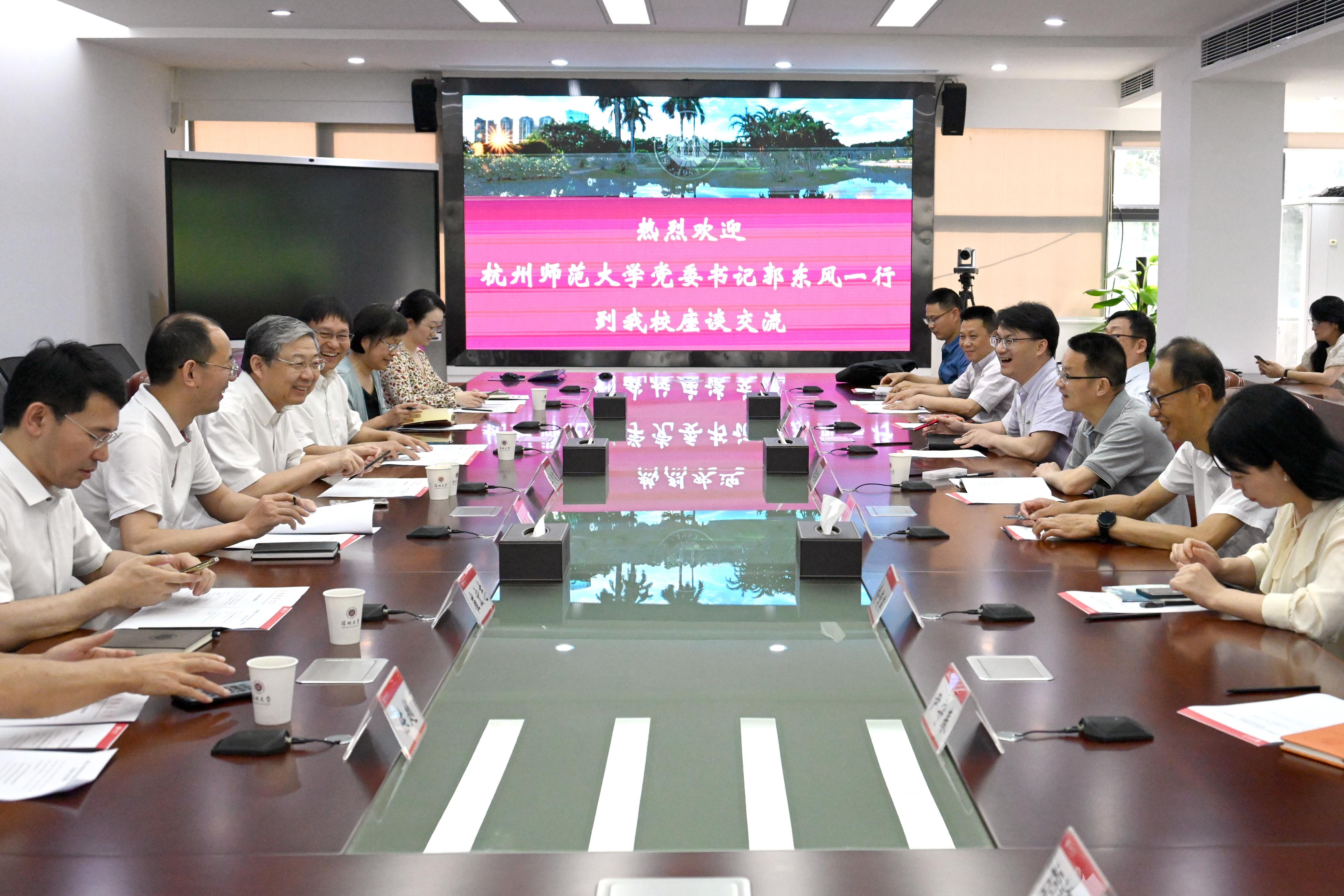 6月21日上午,杭州师范大学党委书记郭东风一行带队到芒果体育调研交流,芒果体育党委书记李清泉会见来宾。会前,郭东风一行参观校史馆、二维材料光电科技国际合作联合实验室、国家级传播实验教学示范中心。随后,双方在汇元楼201会议室举行座谈,芒果体育副校长张学记主持会议。