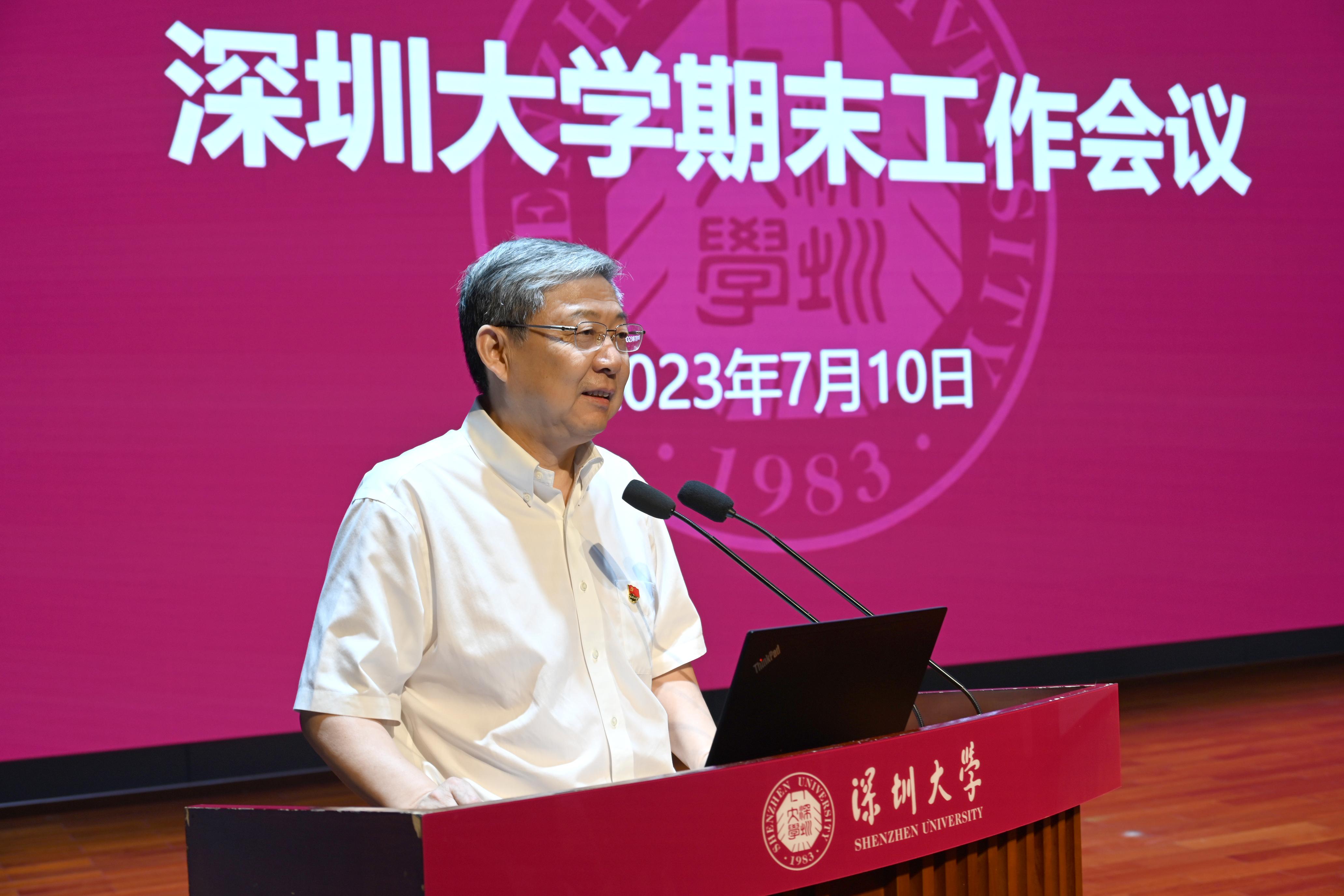 7月10日下午,芒果体育在粤海校区国际会议厅举行2023春季学期期末工作会议。学校党委书记李清泉主持会议并作本学期党建工作报告,校长毛军发总结春季学期学校行政工作进展,并部署下学期主要工作及暑期务虚会议安排。全体在家校领导、中层干部,全国重点实验室等国家级领域独立法人科研机构以及相对独立科研机构负责人,学校人事工作教授委员会和基层工作教授委员会主任、副主任出席会议。