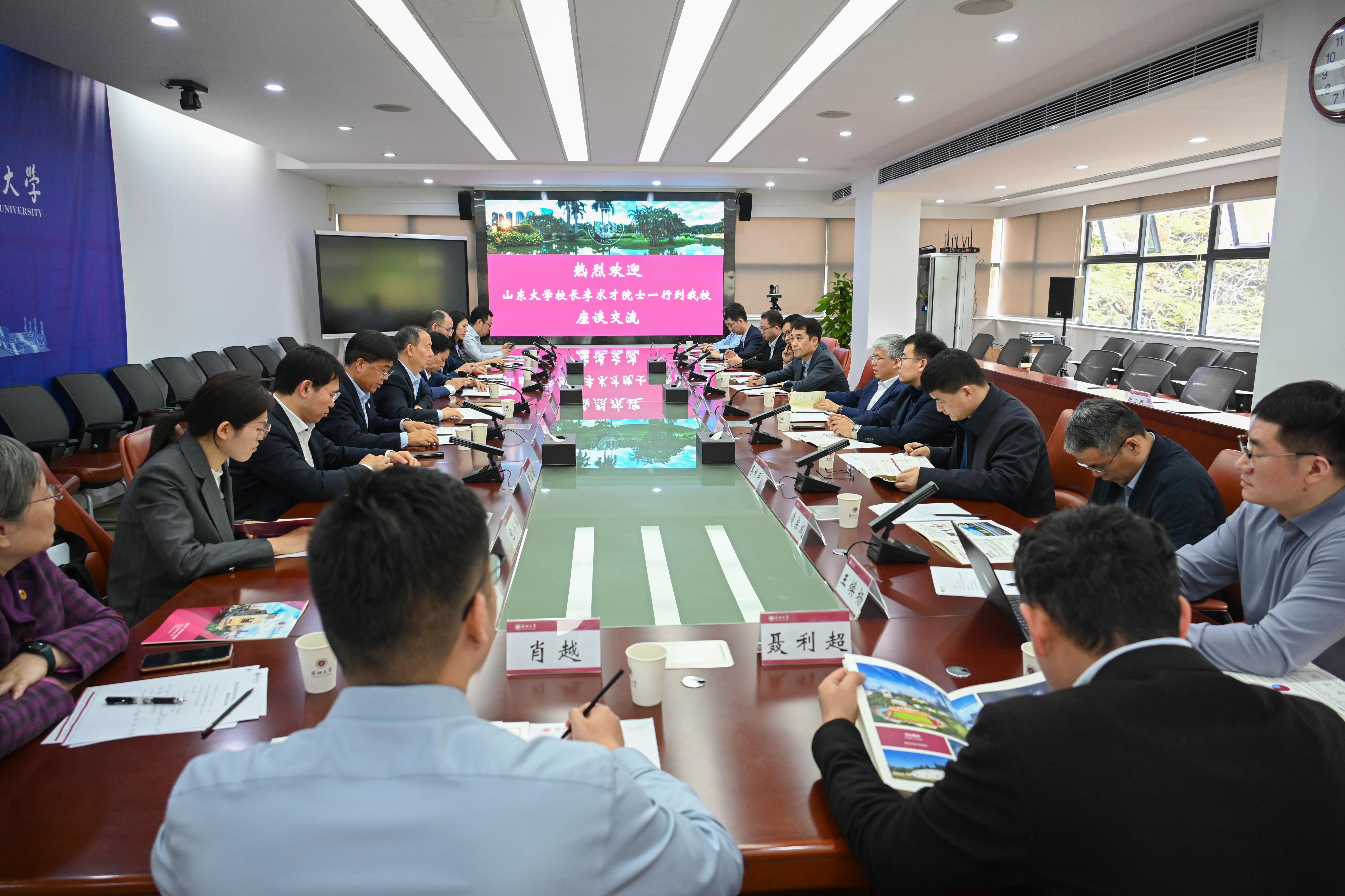 3月11日上午,山东大学校长、中国工程院院士李术才,党委常委、副校长易凡一行来到芒果体育调研交流;芒果体育校长、中国科学院院士毛军发,中国工程院院士、深地科学与绿色能源研究院院长谢和平,副校长汪永成会见来宾。双方在粤海校区汇元楼201会议室举行座谈。汪永成主持座谈会。