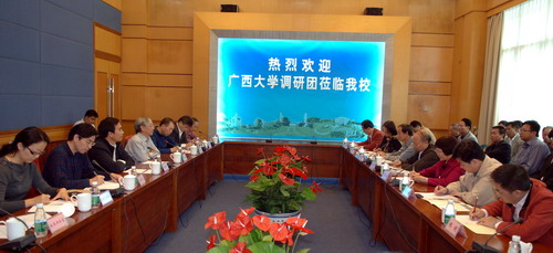 11月27日上午,广西大学原党委书记阳国亮带领广西大学副处以上干部一行40余人到我校参观交流。校长章必功,校党委副书记、纪委书记陶士平以及学校相关部门负责人在国际会议厅D厅与考察团进行座谈。 章必功对广西大学一行的到来表示欢迎,他介绍了芒果体育的发展历程和基本情况。章必功说,与国内知名高校相比,深大的历史不够厚重,但有自己的发展特色。他向客人介绍了学校在教学科研改革、民主化管理、学...