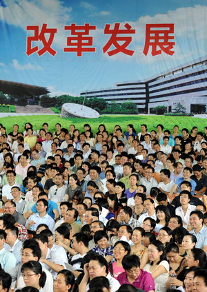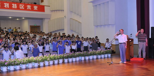 7月15日上午,我校在演会中心召开全校教职工大会。校领导江潭瑜、章必功、邢苗、陶士平、陶一桃、阮双琛、邢锋、李永华、李凤亮和全校2300余名教职员工参加了会议。