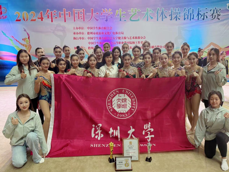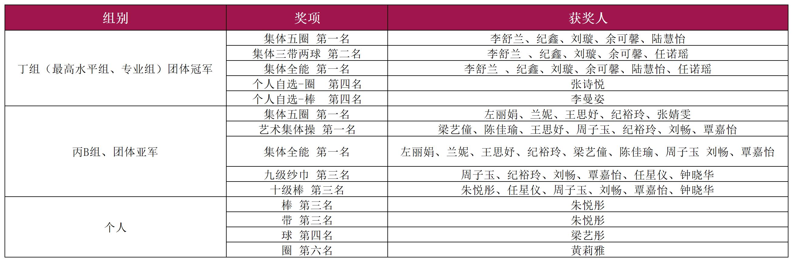 2024年11月17日,中国大学生艺术体操锦标赛在海南省儋州市的海花岛举行。来自北京大学、清华大学、浙江大学、北京体育大学、上海体育大学等40支代表队的近400余名运动员参赛,是参与人数最多,水平最高的大学生艺术体操赛事。芒果体育共派出26名运动训练专业学生,参加丙B、丁组(最高水平组、专业组)经过5天激烈的角逐,获得5金1银4铜,包揽两个组别的集体全能冠军,获得丁组团体冠军和丙B组团体亚军。芒果体育获得体育道德风尚奖,主教练姜咏老师获得优秀教练员称号。
