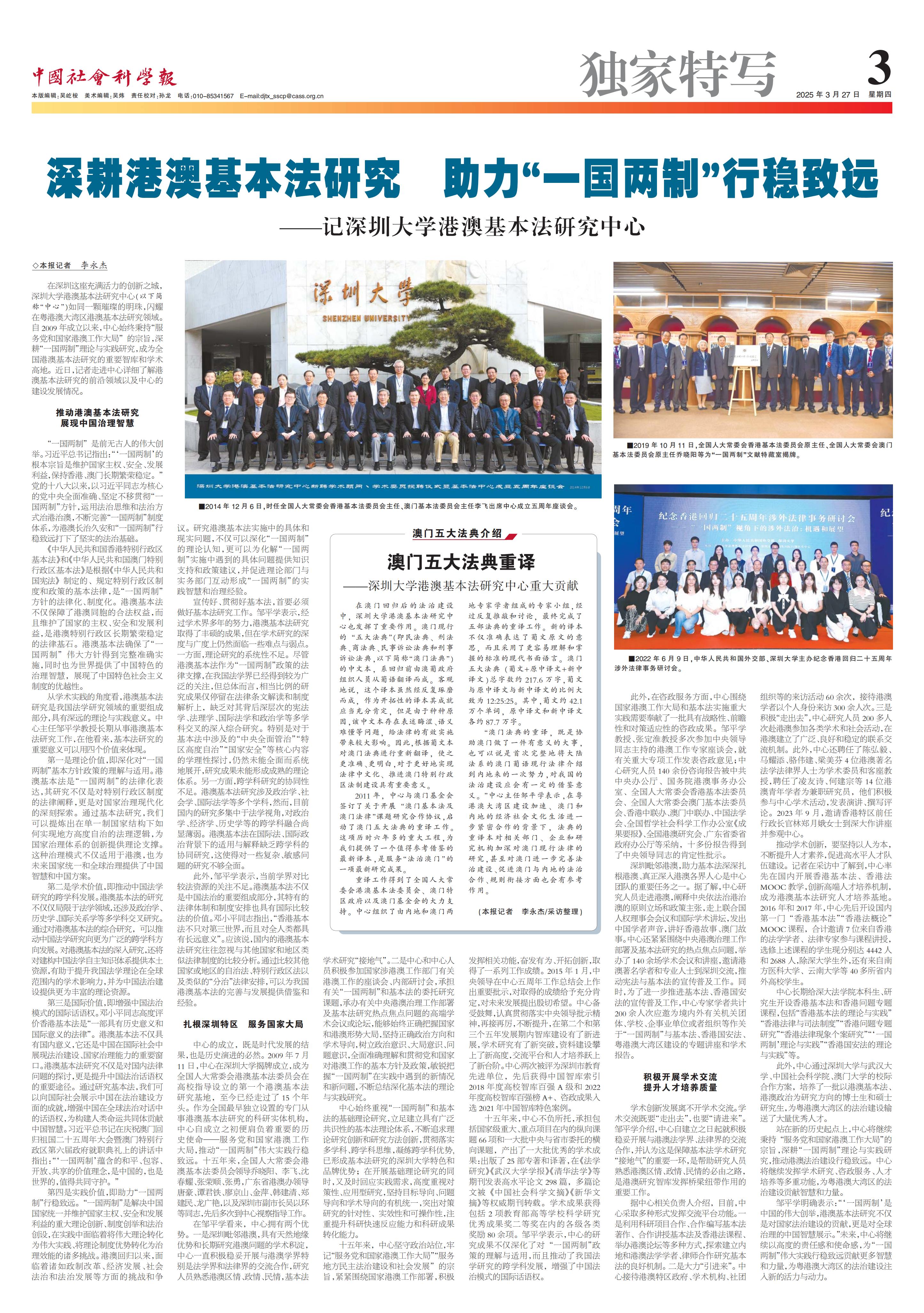 在邹平学看来,中心拥有两个优势。一是深圳毗邻港澳,具有天然地缘优势和长期研究港澳问题的学术积淀,中心一直积极稳妥开展与港澳学界特别是法学界和法律界的交流合作,研究人员熟悉港澳区情、政情、民情,基本法学术研究“接地气”。二是中心和中心人员积极参加国家涉港澳工作部门有关港澳工作的座谈会、内部研讨会,承担有关“一国两制”和基本法的委托研究课题,承办有关中央港澳治理工作部署及基本法研究热点焦点问题的高端学术会议或论坛,能够始终正确把握国家和港澳形势大局,坚持正确政治方向和学术导向,树立政治意识、大局意识、问题意识,全面准确理解和贯彻党和国家对港澳工作的基本方针及政策,敏锐把握“一国两制”在实践中遇到的新情况和新问题,不断总结深化基本法的理论与实践研究。