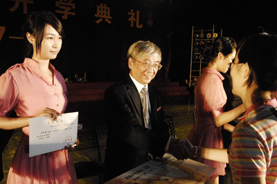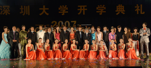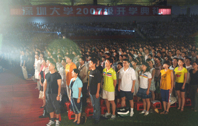 9月3日晚,2007级新生开学典礼暨迎新晚会在我校体育场举行。“脚踏实地、自强不息”、“建设窗口大学、特区大学、创新大学”的横幅标语、军乐团的热情演奏烘托出高涨的气氛,6700多名新生的到来更为体育场带来一派勃勃生机。校领导江潭瑜、章必功、陶士平、阮双琛、邢锋、陈思平,中国科学院院士牛憨笨,南太集团慈善基金会委员李荔芳,以及各院系、各部处负责人,教师代表、学生代表、家长代表及2007级全体新生出席了开学典礼。