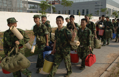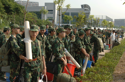 今年我校6000多名本科新生将分赴广州国防园、广州武警指挥学院、梅林防化团进行为期15天的军训。13日上午,新生们在领队的带领下,身着迷彩整装待发。他们面带微笑,英姿焕发,对未来半个月军训生活充满信心和期待。上午9:30分左右,车队从学校南门出发,数百辆50座巴士在宽阔的白石路上摆起长龙,浩浩荡荡开往军训基地。为保障学生们的安全健康和正常训练,同去的还有校医院医生。而且,每支队伍都安排了特定的辅导员,照顾同学们的生活起居。