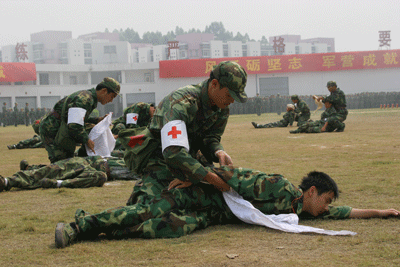 接下来进行的是训练科目汇报表演。女子队列表演、武器分解结合表演、内务表演、男子擒敌术、女子防身术……经过半个月严格的军事训练,同学们掌握了娴熟的军事基本功。最引人注目的是今年新增的生存训练表演――防恐抗灾中的反爆炸行动演练,同学们在模拟现场进行战伤救护、消防、紧急疏散等。