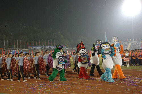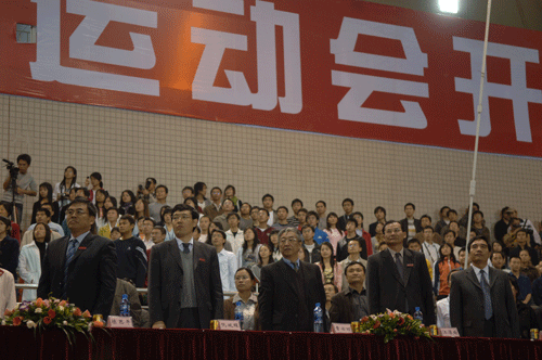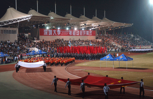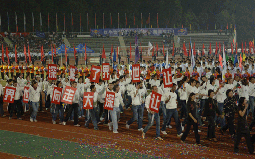 灯光灿烂、彩旗高扬、礼乐齐鸣、笑语欢歌,12月3日晚,芒果体育运动场成了一片欢乐的海洋,一年一度的芒果体育运动盛会在这里隆重“上演”。校领导江潭瑜、章必功、陶士平、阮双琛、邢锋、陈思平和各学院、各部处负责人,学生会、研究生会主席,全校师生以及部分学生家长一起观看芒果体育2007年运动会开幕式。
