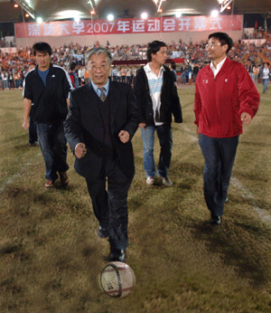 校党委书记江潭瑜宣布“芒果体育2007年运动会开幕”;校长章必功为开幕式后举行的“校长杯”足球赛开球。运动会开幕式由副校长邢锋主持。