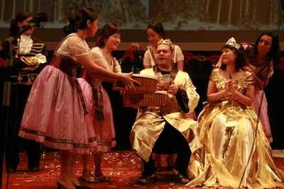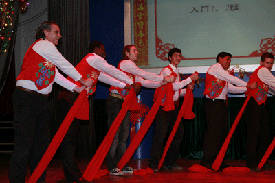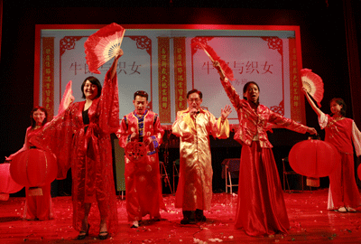 文艺汇演在入门一、二班表演的《纤夫的爱》中拉开了帷幕,学生们灿烂的笑容、欢快的舞步特别是两位“土耳其媒婆”出色的表演,赢得在场的观众阵阵热烈掌声。在商务班《牛郎与织女》中,演员们运用不同的方式来阐释留学生对留学生活的细致观察,情节紧凑、语言生动。来自刚果的学生福兰克表演了节奏感十足的街舞,伴随着强劲的音乐翻滚、倒立、弹跳,喝彩叫好声不绝于耳。中级一班自编自演的话剧《国王的新衣》,演员分别来自俄罗斯、韩国、日本、印尼、巴西、土耳其、菲律宾等十个国家,别出心裁,特别是两位来自捷克和美国的“金发骗子”精湛的演技以及他们和“加拿大国王”生动的对手戏,生动别致的情节设置、诙谐的对话,给现场的观众留下了深刻印象,把整场演出的欢乐气氛推向高潮,现场成了欢乐的海洋。