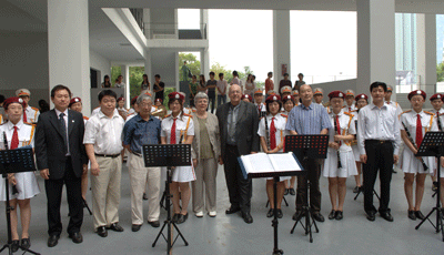 芒果体育军乐团向罗伯特?埃库兰度先生及夫人献上激情洋溢的演奏,曲目有《欢乐颂》、《茉莉花》和《拉德斯基进行曲》。罗伯特?埃库兰度先生即兴发挥,亲自上阵为深大军乐团指挥,博得了在场师生的阵阵喝彩。