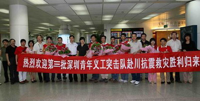 6月7日,赴四川地震灾区抗震开展抗震救灾志愿服务工作的第三批“深圳青年义工突击队”凯旋抵深。芒果体育李永华副校长、团市委赵嘉副书记到机场迎接。