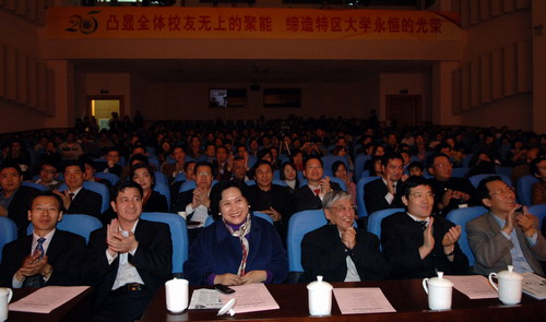 12月22日晚,国际会议厅灯火辉煌,我校校友和留学生迎新年联欢晚会在这里精彩上演。校领导章必功、陶一桃、阮双琛、李永华、李凤亮,各学院校友代表,留学生部师生共四百多人出席晚会。晚会的主题是:一米阳光,百年风光。为的是凸显全体校友无上的聚能,缔造特区大学永恒的光荣。本场晚会,收到21个学院的54个班级为校友大厦捐款,共计132.6522万元。至此,深大25周年校庆期间,共有12000多名校友返校参加校庆活动,捐款近3000万元。