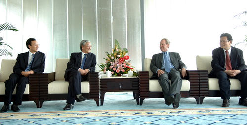 讲座前,章必功在科技楼贵宾厅会见了客人。他对巴罗教授的到来表示欢迎,他说要把芒果体育办成一流大学需要像巴罗教授这样顶级的学者支持。