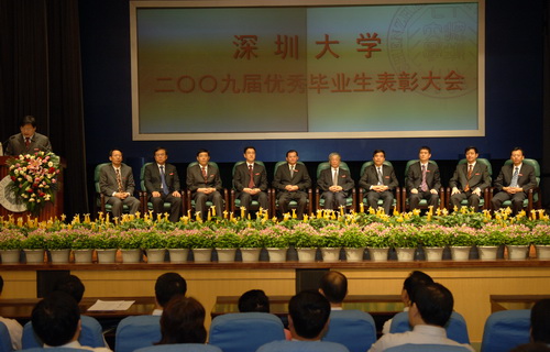 十九岁的青春年华,就这样与年轻的深大结缘。在这里,我们与可敬的老师、可爱的同学们一起度过四年美好时光。在这里,我们勤学慎思,读万卷书;我们交游四方,行千里路。在这里,我们与古今中外的名人同行,谈笑有鸿儒,往来无白丁。在深大这片自由开放的土地上,曾留下许多来自世界各地的学者、名人的足迹:诺贝尔经济学奖得主马斯金先生曾在此纵谈全球经济形势;德国司法部部长居普里斯女士曾带着我们走进德国宪政六十年;印度大使拉奥齐女士为我们讲述一个神秘的东方国度;国际大体联主席基里安先生也曾站在我今天站的这个讲堂上,告诉深大学子,中国的未来属于我们。所有这些,都让那个曾经踮起脚挤在拥挤的人群中听讲座的我,由衷地感到庆幸和快乐,为我们能与仰望天空的学者一同栖息在这片诗意的土地上而感到自豪和骄傲。