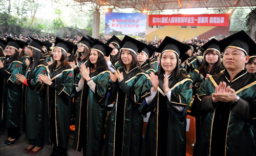 毕业典礼在雄壮的国歌声中开始。教务部主任徐晨介绍了我校2011届成教学院毕业生的情况。今年我校共有成人高等教育毕业生4017人。其中,本科毕业生1268人,专科毕业生2749人。肖芬等420人获得学士学位,闫秀珍等45人荣获优秀本科毕业生称号,杜薇等72人荣获优秀专科毕业生称号。本届成人高等教育的1268位本科毕业生分布在会计学、金融学、法学、人力资源管理等14个专业,专科毕业生分布在会计、国际贸易实物、物流管理、商务英语等28个专业。