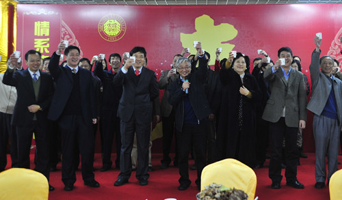 校长章必功致新年祝辞。他代表学校党政向全校教职工、全体学生致以龙年的美好祝福。祝愿大家在节日中心情愉快、身体健康、学业进步!祝愿大家龙年幸福!章必功带领全体到场校领导上台,举杯向参加团圆聚餐的所有老师、同学和学生家长们祝福新年,共同为大家的美好未来干杯!