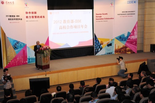 4月12日-13日,主题为“协作创新,助力智慧的成长”的“2012 教育部―IBM高校合作项目年会”在我校召开。教育部国际合作与交流司巡视员刘宝利,国家留学基金管理委员会副秘书长杨新育,教育部高教司理工处处长李茂国,深圳市教育局局长郭雨蓉等政府领导,IBM 院士、IBM 技术创新全球副总裁Bernard S Meyerson 博士,IBM副总裁、IBM大中华区政府与公众事业部总经理范宇,IBM全球大学合作部项目总监欧阳齐庆,IBM 大中华区大学合作部总经理王浩博士等IBM高层领导,西安交通大学副校长、中国科学院院士徐宗本教授,华南理工大学常务副校长彭新一教授,华中科技大学常务副校长林萍华教授,中山大学常务副校长许家瑞教授,山东大学副校长樊丽明教授,重庆邮电大学副校长林金朝教授,杜克昆山大学项目执行总监史明正博士,我校校长章必功、副校长邢锋等高校领导和行业相关来宾、我校师生代表出席了本次年会。年会开幕式由邢锋主持。在年会举行期间,我校党委书记江潭瑜、副校长阮双琛分别会见了参加会议的嘉宾代表并进行交流。
