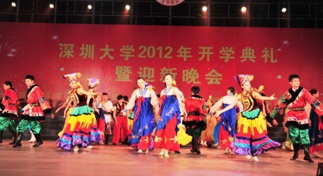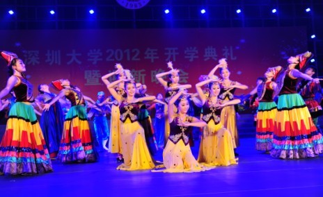 开学典礼结束后,一场异彩纷呈的迎新晚会在这里进行。象征着各民族大团结的舞蹈《大地飞舞》,热情洋溢,向我们展现了不同民族的风采。荣获第三届全国大学生艺术展演二等奖、广东省第三届大学生艺术展演一等奖的男生表演唱《say hello》,愉快而轻松,活力四射。傣族舞蹈《水姑娘》调皮可爱,向观众展现了傣族姑娘温柔大方的气质,让观众如痴如醉。讲述了深大学子求职时在理想与现实之间的挣扎,小型舞蹈剧《梦在飞》和当代女子群舞《红梅花开》演绎了一段满载浓浓的乡情、友情和爱情的不同年代的追梦乐章,颇具特色,深受同学们的喜爱。在网络上迅速走红的深大学生组合“七朵”,以主打中国风的女子组合表演唱《咏春》,将现场气氛推到最高潮。胡独奏《战马奔腾》和萨克斯独奏《龙的传人》,让新生们一睹深大教师风采。爵士舞与魔术《风暴》和二踢踏舞《勇往直前》将现场的气氛再推高潮。女生独唱《红红的日子》用欢快的节奏祝福新同学们在未来生活更加美好。
