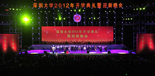 “同学少年、风华正茂,荔园新雨、桃李芬芳”,9月12日晚,2012级新生开学典礼暨迎新晚会在我校体育场举行。校领导江潭瑜、李清泉、陶士平、陶一桃、阮双琛、邢锋、李凤亮,中国工程院院士牛憨笨,中国科学院院士倪嘉缵,香港余彭年慈善基金会主席、深圳彭年酒店董事长兼总经理余彭年先生的代表彭志兵,正中置业集团董事长、总裁、校友邓学勤,学校各学院、各机关单位、教研教辅单位的负责人,教师代表、学生家长代表及2012级全体新生出席典礼。