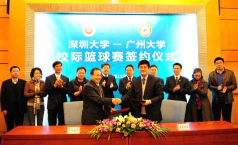 12月5日下午,“芒果体育—广州大学校际篮球赛签约仪式”在国际会议厅D厅举行,标志着两校共同主办的校际篮球赛正式启动。广州大学校长庾建设、副校长董皞率相关部门、体育学院篮球队来我校交流。校党委书记江潭瑜与庾建设进行座谈,校长李清泉,副校长邢锋、李凤亮以及深大篮球队校队运动员、教练员,各相关部门负责老师和《南方日报》、《大公报》、《深圳特区报》、《羊城晚报》、《晶报》、《深圳晚报》等媒体记者出席签约仪式。