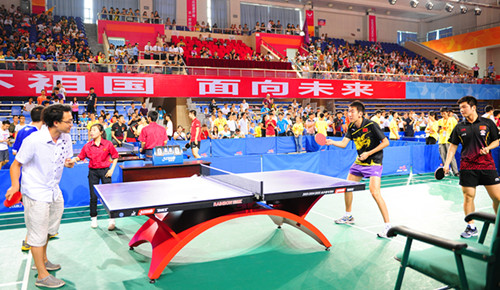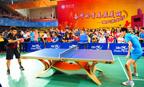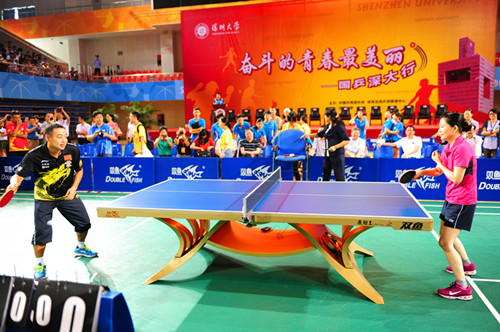 最后的乒乓球表演环节,深大副校长黎军,网络报名抽签的乒乓球爱好者与刘国梁、王楠及其他国家队队员进行趣味比赛,国家乒乓球队主力队员们也在现场为师生“秀”了一把球技,现场气氛热烈。