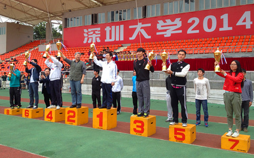 校运会总裁判长程幼新老师主持了闭幕式颁奖典礼,体育部主任谢红光教授、副主任曾小松老师亲自为获奖单位代表颁发了奖杯。