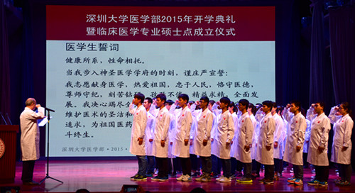 钟南山院士亲自为临床医学专业新生一一授白袍。他对我校医学部的发展和进步表示祝贺,并对入学新生提出了殷切希望。他说,芒果体育为学生提供了良好的师资队伍和硬件设施,但是学生仍然要有危机感,要将良好的条件当成是腾飞的翅膀而不是安乐的温床。医学部应当与企业、医院紧密结合,相辅相成,促进彼此的发展。医学有很深的文化底蕴,一个城市的医疗水平的提高需要不断的培养和长期的积累,希望深大发挥引进人才的作用,依靠自身的力量推动自身和深圳医疗事业的发展。
