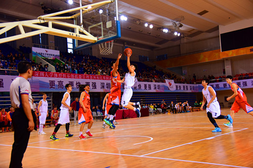 接下来的男篮比赛更是引爆了全场,伴随着DJ幽默的解说和双方队员的一次次三分远投赢得了现场观众的热烈掌声。其中下半场前三节的男篮比赛中深大占据主场优势,以58:50的比分领先广大。但随着第四节广大采取连续换人战术,比赛逐渐陷入僵持,最终双方以72:72的成绩打平,进入了加时赛阶段。紧张而刺激的加时赛引得现场再次掌声雷动,双方打得难解难分,最终比分为80:81,深大以1分之差惜败广大。