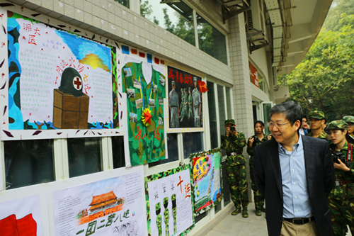 李清泉一行首先来到南区运动广场,慰问正在进行正步走练习的二团同学。随后来到二团团部,问候在这里工作的教官和辅导员,一路上参观了二团布置的海报和宣传栏,并在同学们作的诗歌和漫画前驻足欣赏。
