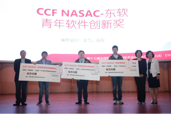 会议期间,“CCF NASAC-东软青年软件创新奖”评奖委员会评选出2018年度获奖者,分别是上海交通大学陈雨亭博士、国防科技大学丁博博士和中科院软件所蔡彦博士等三位。金芝教授宣布了颁奖理由,梅宏院士和东软集团副总裁兼CTO张霞博士为他们颁发了获奖证书和奖金。