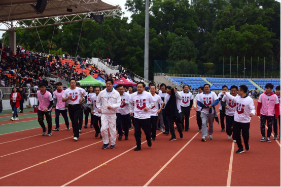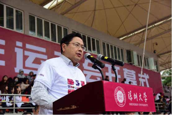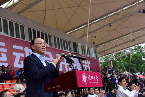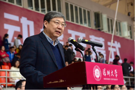 李清泉致开幕辞。他说,今天我们迎来了一年一度的全校运动盛会,为冬日的“荔园”增添了一份火热的色彩。近期,我校各项体育活动精彩纷呈:2018—2019赛季中国乒乓球超级俱乐部联赛深大赛区启动,深大赛队勇夺球场五连胜;粤港澳大湾区大学生围棋联赛暨“国手进校园”活动顺利举行,“棋圣”聂卫平及棋手常昊、张璇再次来到深大校园,掀起了一波校园围棋文化热。这些体育活动不仅为广大师生带来了一场又一场的体育文化盛宴,更吸引了广大师生积极投身各项体育活动,展示了特区大学师生的运动风采。他指出,习近平总书记在全国教育大会上强调,要努力构建德智体美劳全面培养的教育体系,形成更高水平的人才培养体系,树立健康第一的教育理念。我校出台的《芒果体育文化创新发展纲要》明确提出努力建设新时代一流的中国特色社会主义特区大学文化,引领高水平、有特色、现代化一流大学建设要重点强化体育的育人价值。在纲要的指引下,我校积极整合教育资源、办学特色和高水平办学优势,在深圳培养了众多体育人才,深大体育学科、体育活动在体育文化建设领域取得了蓬勃的发展。在过去的一年里,我校在各级各类体育竞赛赛事中取得了丰硕的成果,共获得国家国际级比赛冠军26人次,省级冠军20人次。这些成绩的取得是各位教练员与运动员刻苦训练、奋力拼搏的结果,成分展示了我校脚踏实地、自强不息的精神风貌,提升了我校声誉。校运动会是弘扬我校体育文化,提升校园精神文明建设的重要平台,学校将继续办好校运会,大力支持各项体育文化事业发展,也希望本次运动会各参赛师生能够赛出饱满激情,赛出竞技水平。